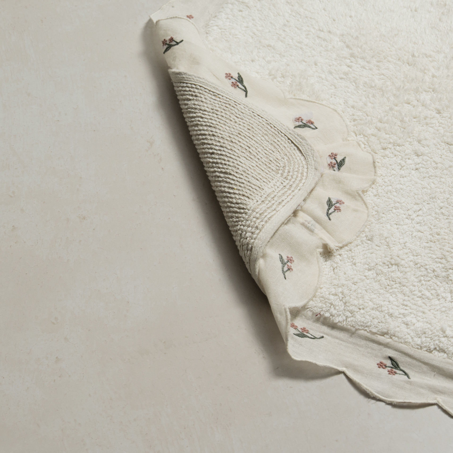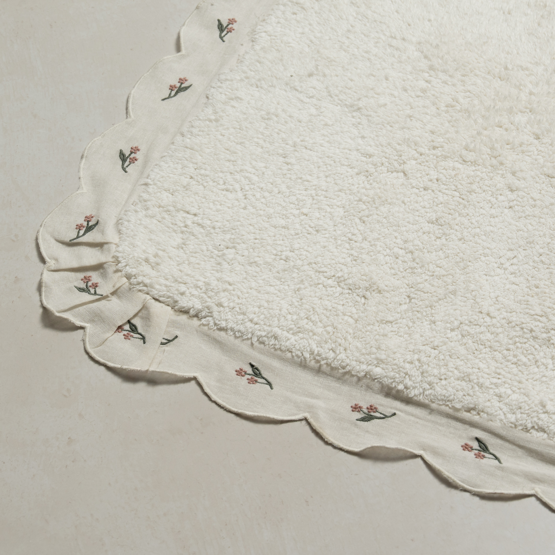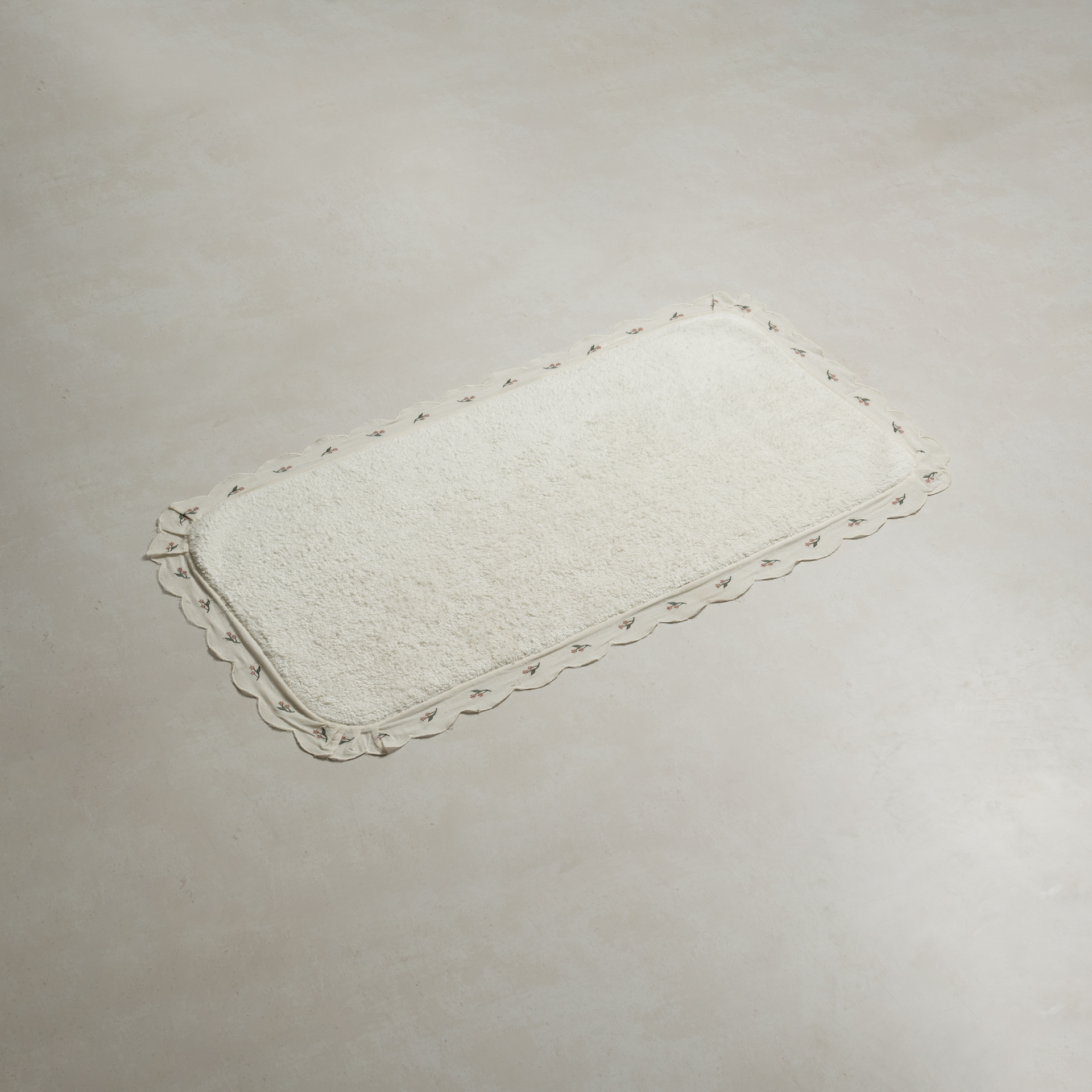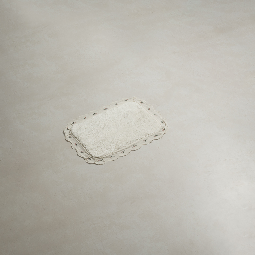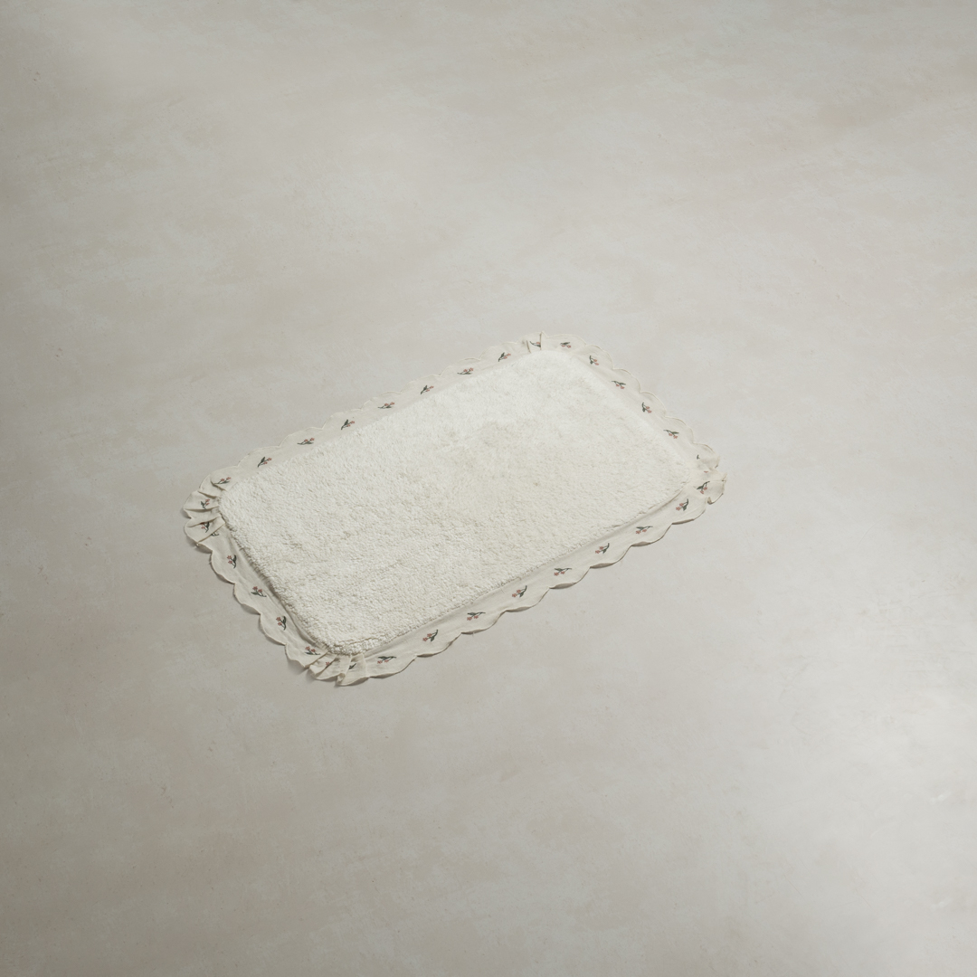 دعّاسة حمّام أنيقة بلون أوف وايت، مزيّنة بتطريز مميز بلون أخضر غامق يضفي لمسة طبيعية وراقية.