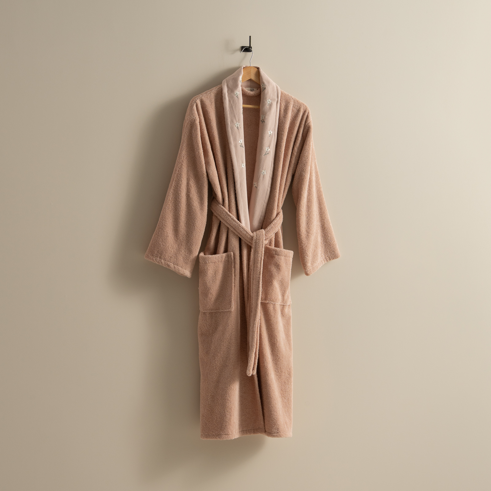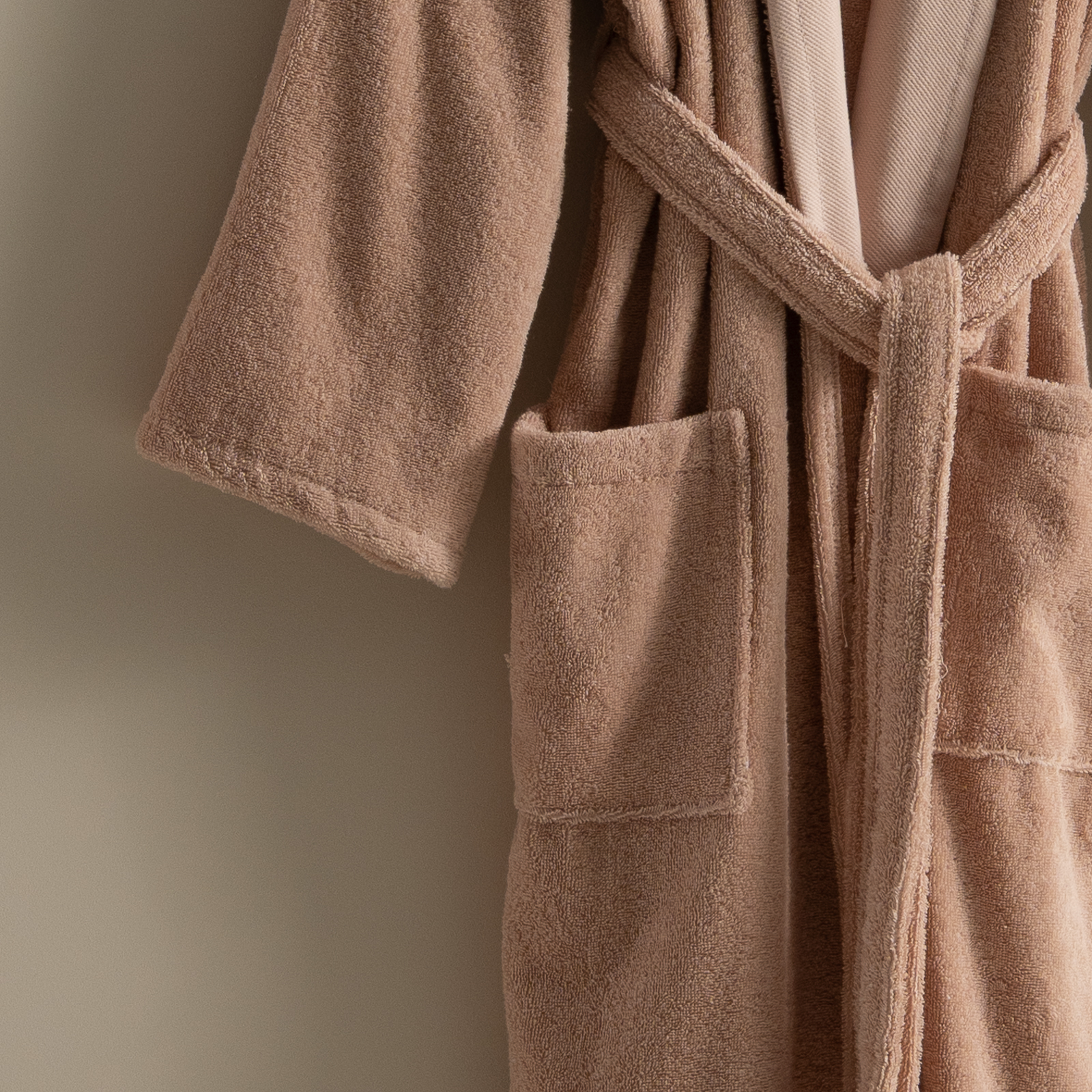 مصنوع من قطن 100% ناعم وعالي الامتصاص، بتصميم لف عملي مع حزام خصر وجيوب جانبية.