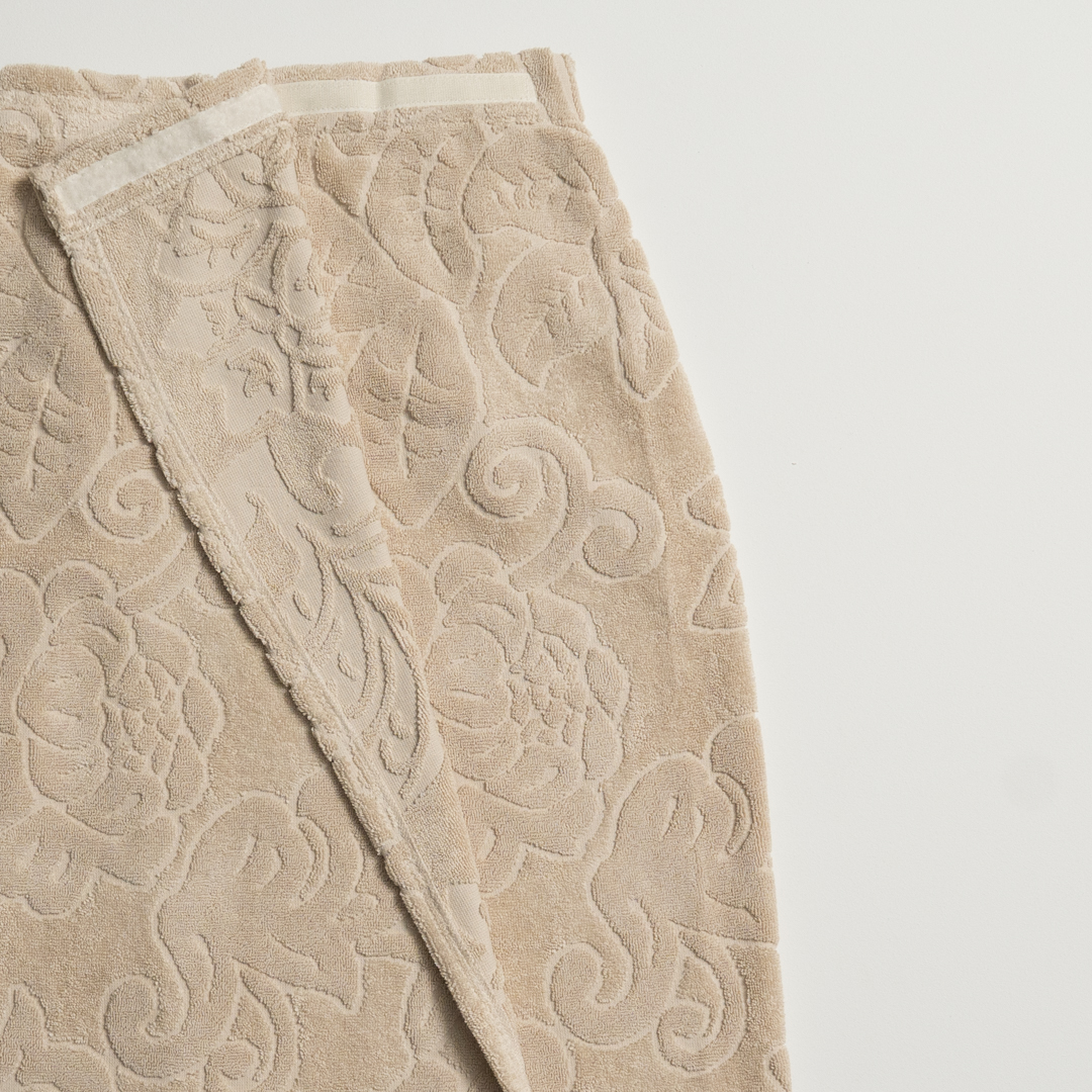 أضيفي لمسة فخامة إلى روتينك اليومي مع روب الحمام الجاكار بلونه الأوف وايت المطرز أخضر غامق وتصميمه الأنيق الذي يجمع بين الراحة والمظهر الراقي. مثالي للاستعمال بعد الحمام أو للاسترخاء في المنزل.