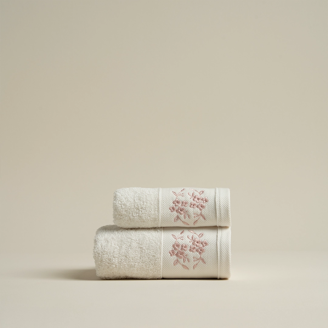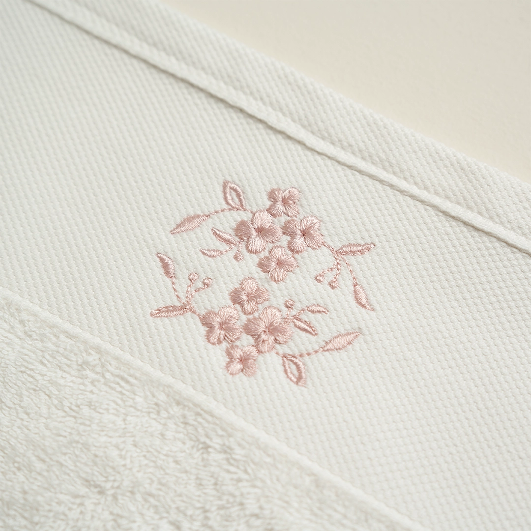 التطريز بلون وردي ناعم يضيف لمسة من الرقة والحرفية. التفاصيل الأنيقة تعكس الذوق الرفيع في اختيار منسوجات الحمام.