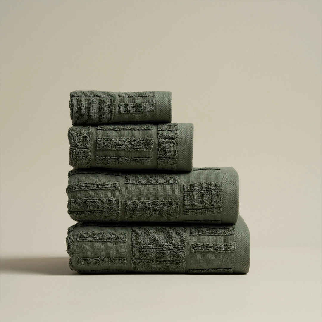 منشفة بتصميم جاكار فاخر يمنحها عمقاً بصرياً فريداً دون الحاجة للتطريز، النسيج نفسه هو قطعة فنية.