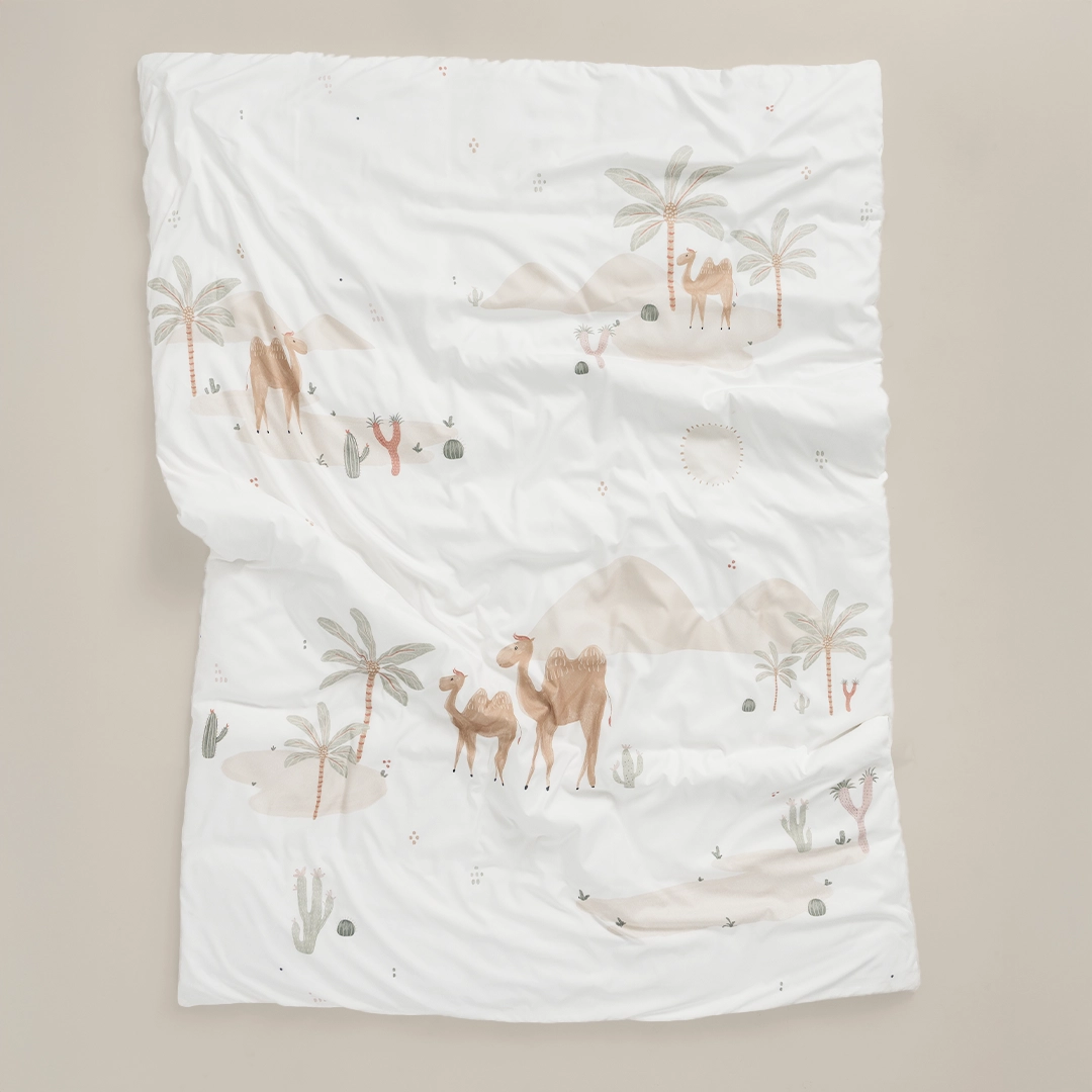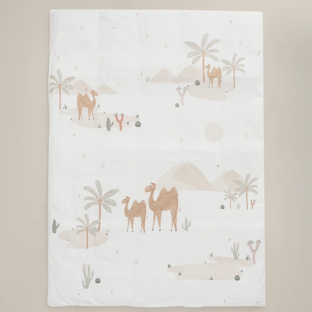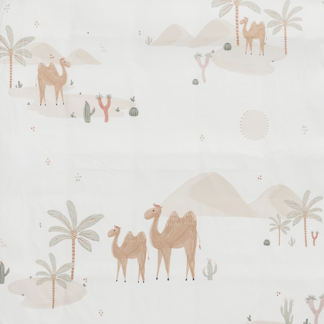 الأناقة العصرية وسحر الصحراء الهادئ مع بيت اللحاف الميكرو هذا. يتميز هذا البيت بتصميمه الفريد الذي يجسد روح التراث بمنقوشات جذابة للجمال والنخيل. لونه الأوف وايت النقي يضفي شعوراً بالاتساع والهدوء، بينما تمنحك خامة المايكروفايبر نعومة فائقة وراحة تدوم.