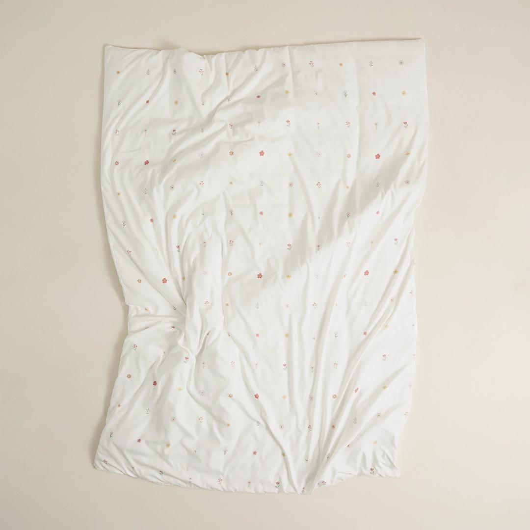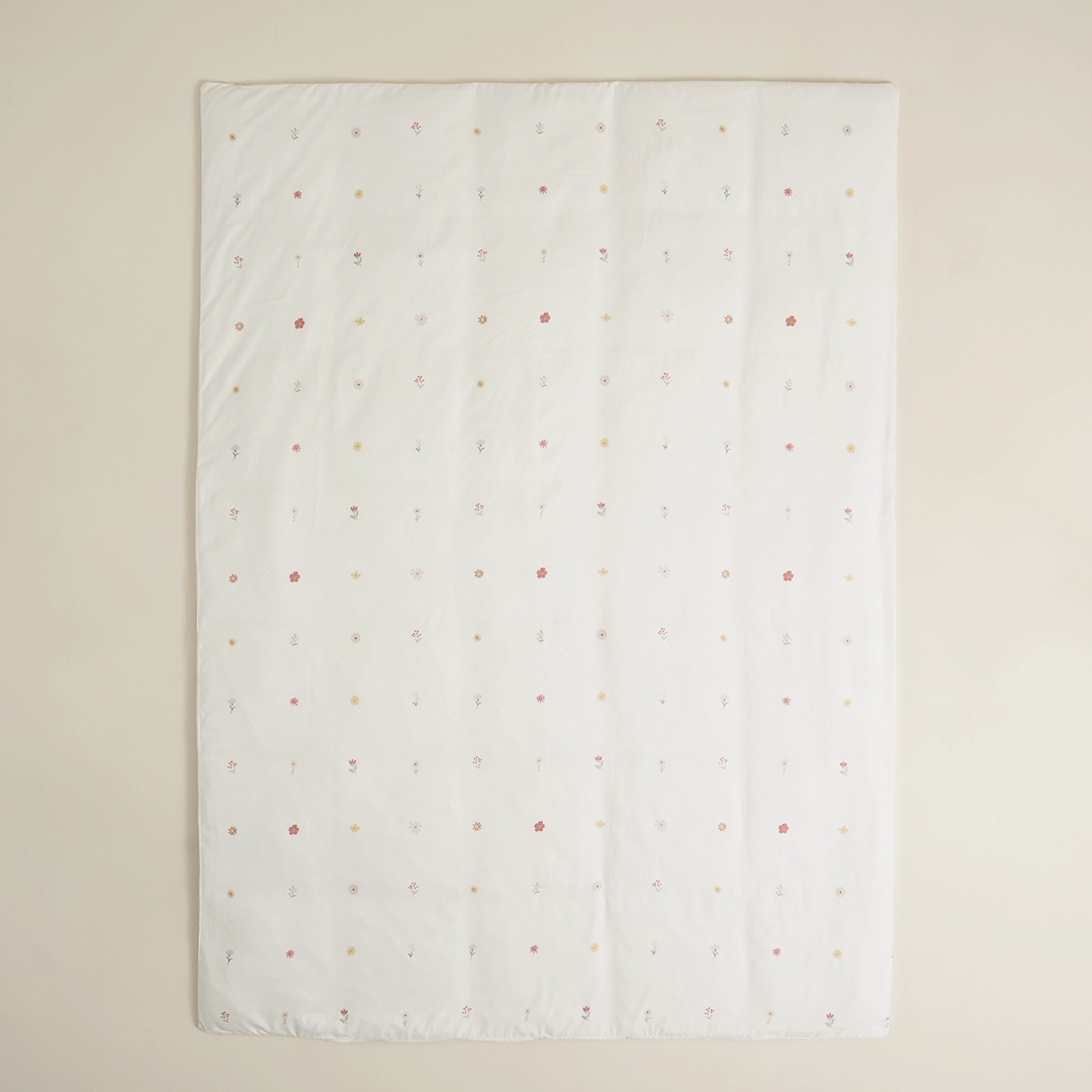 بيت لحاف برسومات زهور لطيفة يناسب غرف البنات، بدون حشوة فقط تلبيسة، يمكن حشوه بحشوة متوفرة لديك او شراء حشوة مناسبة لمقاسه من الحشوات المتوفرة لدينا والتي تثبت عليه بأربطة جانبية، بالإضافه انه قابل للغسيل حسب تعليمات الغسيل الموضحه بالأسفل، متوفر باللون الأوف وايت بمقاس مفرد مكون من قطعه واحده، من بيتي الصغير