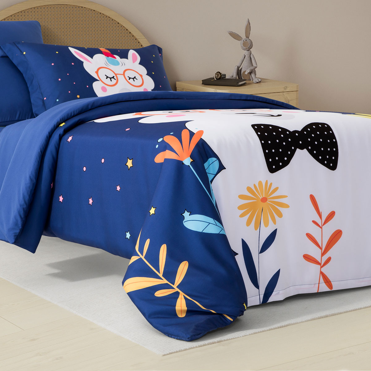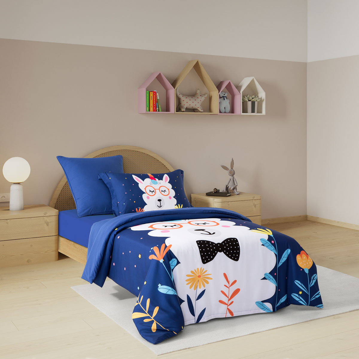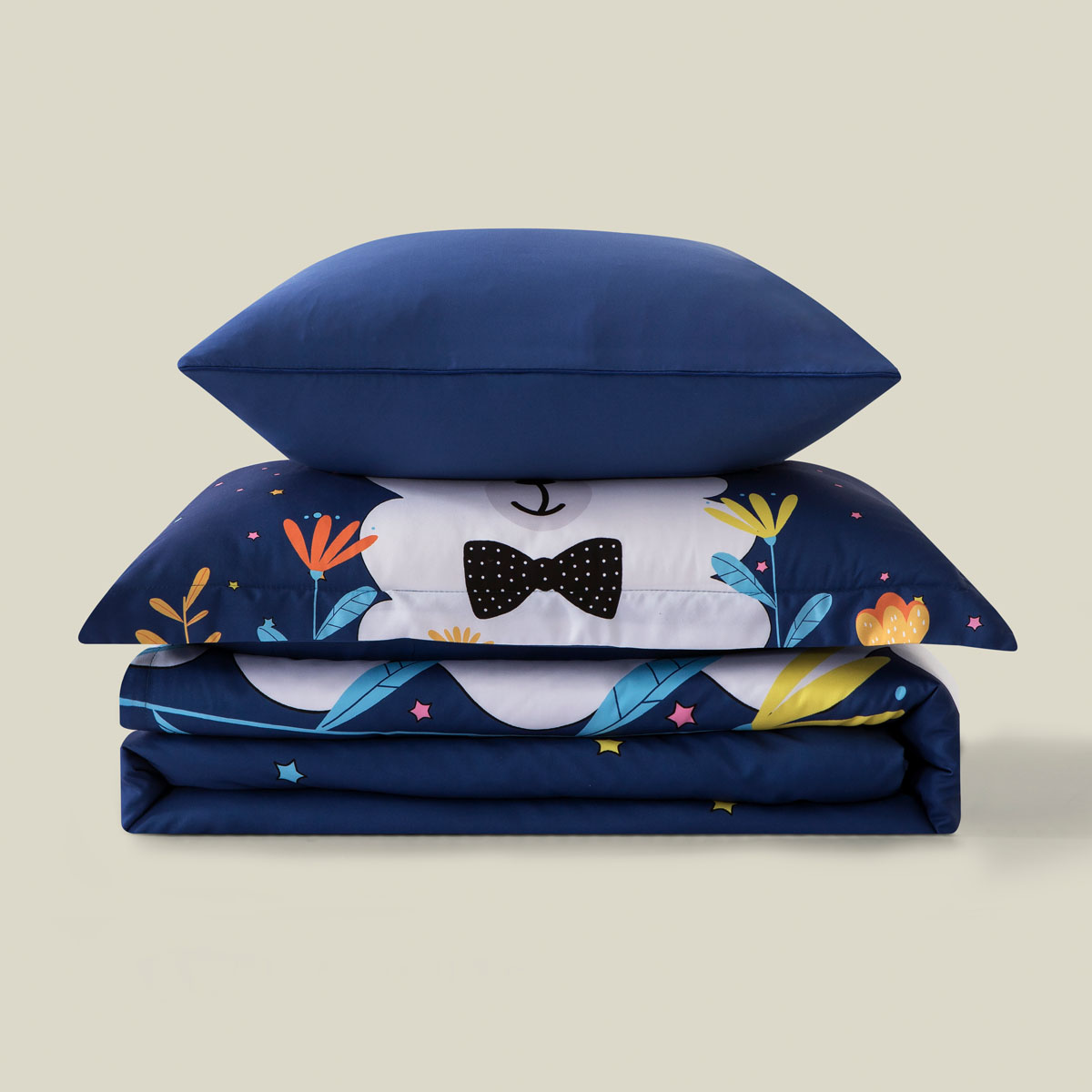 طقم أطفال متكامل (4 قطع) بمقاس مفرد ، يتميز بـاللون الأزرق الغامق وتصميمه الحيوي برسومات كرتونية/ملونة. صُنع الطقم من قماش البوليستر 100% المتين والناعم، وهو بدون حشوة لمرونة اختيارك. الطقم عملي للغاية، حيث يتميز بمقاومته الفائقة للتجاعيد، سهولة غسله، وسرعة جفافه، ويشمل بيت لحاف، وشراشف مطاط، وبيت مخدة وبيت تكاية.