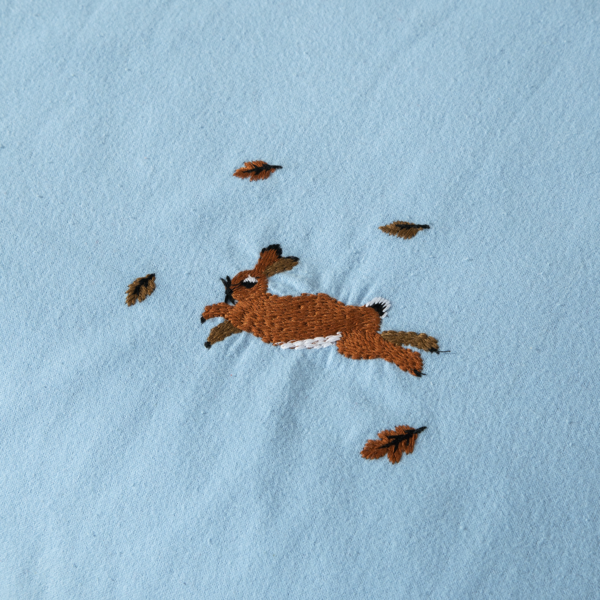 طقم اللحاف القطني ازرق مع تطريز الغزاله يقفز وأوراق شجر تميم راقى وعصرى يليق مع غرف الاطفال.